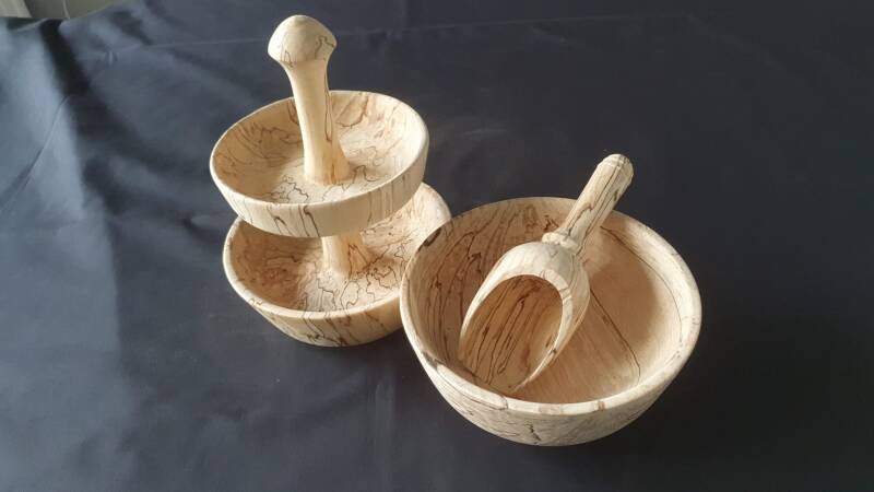 Etagère en schaal en Schepje van Berkenhout met 'slaap'